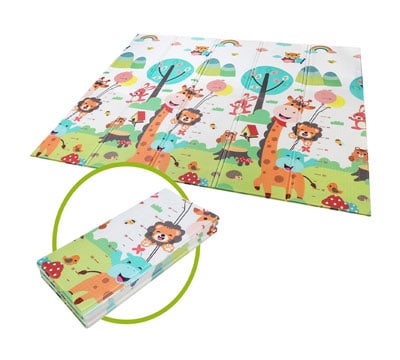 Es un modelo reversible, que cuenta con dos patrones diferentes de cada lado. Por un lado, tienes un diseño de animales, en el cual tendrá actividades sencillas, con las cuales se puedes enseñar los números. Por el otro lado hay un diseño de carretera, ideal para que se entretenga con juguetes con ruedas.
